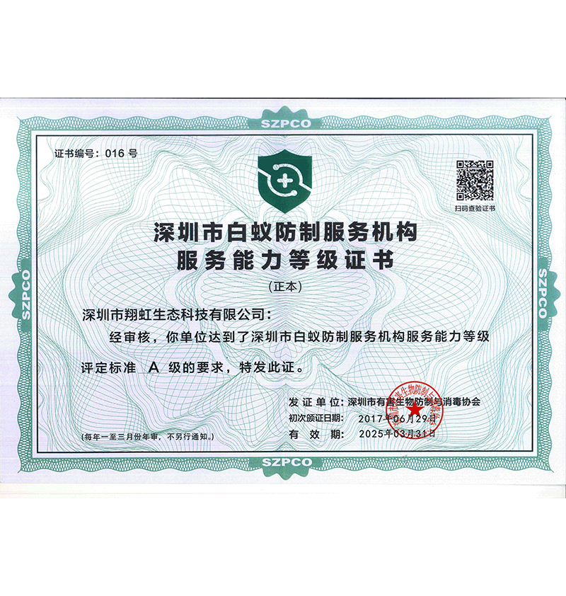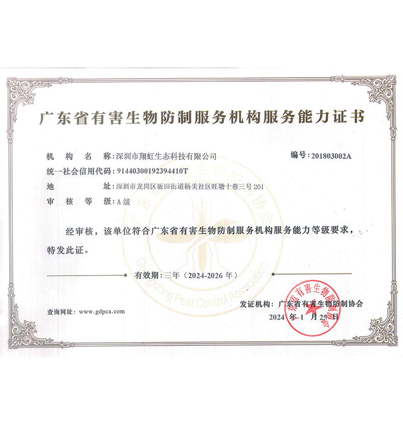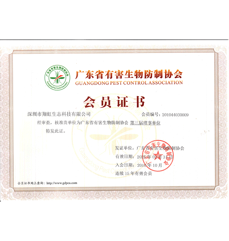 深圳市翔虹生態(tài)科技有限公司成立于1995年,是深圳最早成立的專業(yè)蟲(chóng)害防治公司之一。公司發(fā)展至今獲得全國(guó)有害生物防制服務(wù)A級(jí)資質(zhì)、廣東省有害生物防制服務(wù)A級(jí)資質(zhì)、深圳市有害生物防制服務(wù)A級(jí)資質(zhì)、廣東省有害生物防制服務(wù)A級(jí)資質(zhì)、深圳市有害生物防制服務(wù)甲級(jí)資質(zhì)的單位,是中國(guó)有害生物防治協(xié)會(huì)會(huì)員、廣東省有害生物防治協(xié)會(huì)會(huì)員、深圳市有害生物防治協(xié)會(huì)理事單位,多次獲得“深圳市十佳消殺單位”榮譽(yù)。